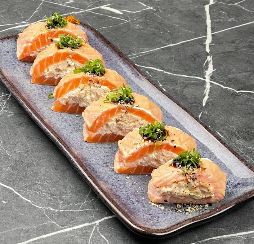 6 unidades salmão selado, recheado com camarão alho e óleo cream cheese e cebolinha